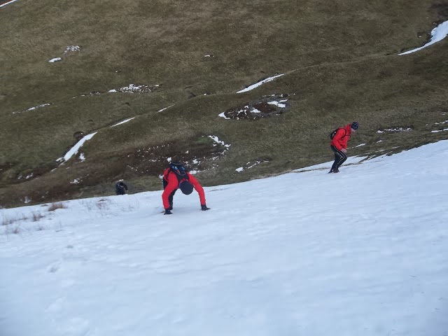 | Paul and Jonathan heading down from Great Gable, a skilful and controlled descent. If you look carefully, you can see a delicate grove in the snow made by my bum! |