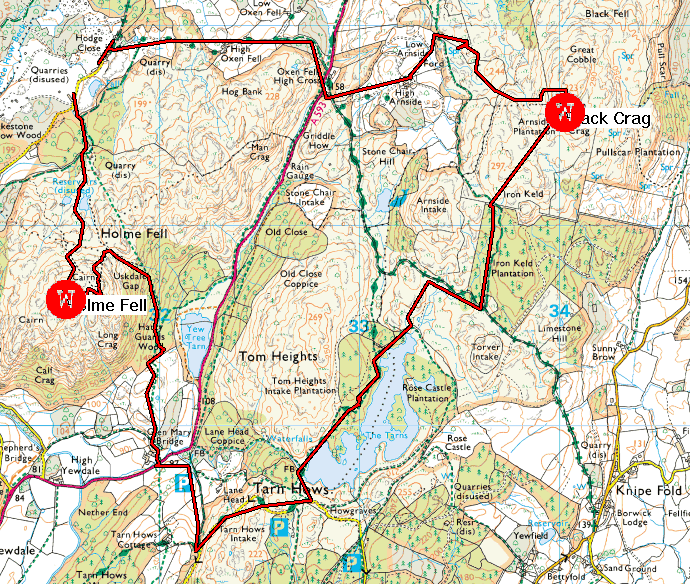 Joss Naylor was then the record holder with a time of just over 7 days. At Keswick, Steve talked about previous attempts at the record, how he was going to gain time on Joss by resting less and taking a better route. He also talked about somebody who had attempted to do a book a day (The Wainwright guides are a set of seven books covering the different parts of the Lake District). Shortly after this I started drawing squiggly lines on maps. I remember a Facebook post about the Ellenborough Running Club doing the North Western Fells in one go. This was my first option. It is all familiar ground and quite easy route finding. I was put off a bit by the repeated complete drops down to road level. In the end, the deciding factor was that I couldn't work out a nice loop. I could only make a linear route, starting at Sale Fell and ending at Castle Crag (Rosthwaite). I would be dependent on someone dropping me off or picking me up and I didn't want to be.
