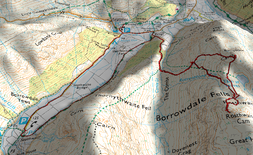 Our route started at Seathwaite Farm, we went along the road to the car park at Seatoller and took the track through the car park which meets up with the bridleway that runs alongside the road up to the Slate Mine.